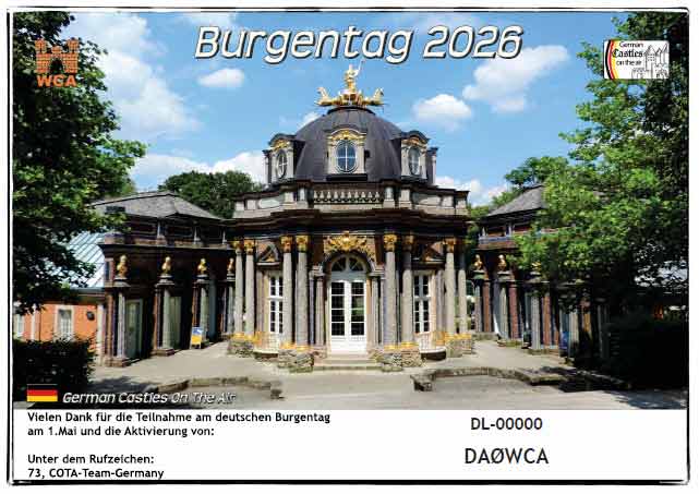 Die Urkunde zeigt in diesem Jahr das Neue Schloss Eremitage DL-03151. Es gibt keine Auswertung. Mitmachen kann jeder, egal ob er 5 Verbindungen von einer Burg oder 500 beisteuert.
